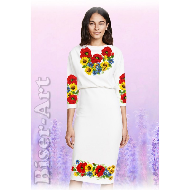Заготовка для вишивки бісером (вишивка нитками,вишивка хрестиком,комбінована вишивка) жіночого плаття. Тканина – білий габардин. Розмір відрізків тканини: перед та спинка – 70х110см.; рукава 2 шт. – 60х70, допустима похибка +/-5 см. Флізелін додається. Тканина розрахована до 54 розміра. УВАГА ВИРІБ НЕ ПОШИТИЙ.