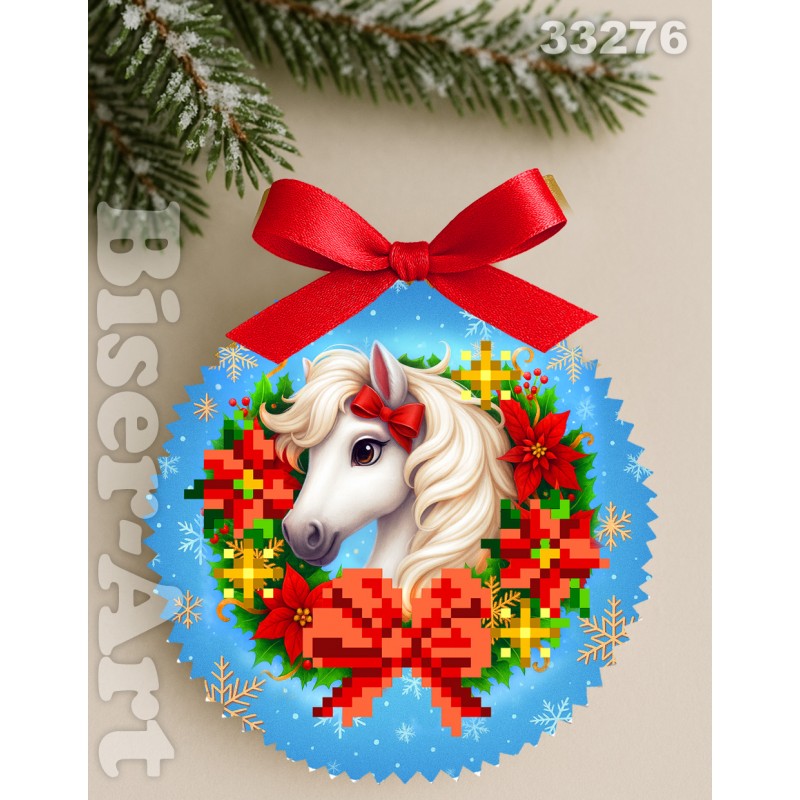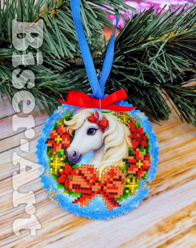 Пошита новорічна іграшка діаметром ~10см. Малюнок по обидва боки. Тканина габардин. Наповнювач холофайбер. Комплект бісеру вказаний на обидві сторони.